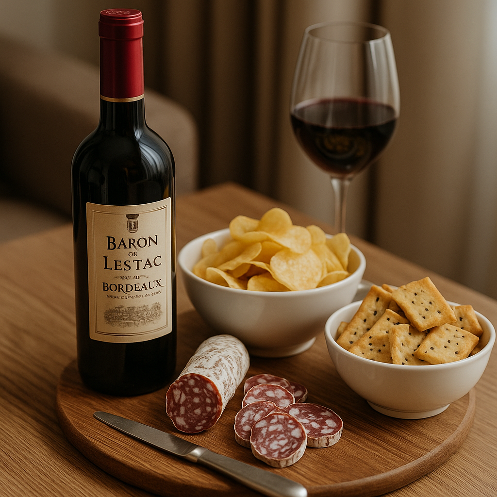 Pack Apéro Français – Une bouteille de Bordeaux, saucisson sec, chips croustillantes et crackers salés. Le plaisir simple et authentique de l’apéritif à la française, prêt à déguster dès votre arrivée.